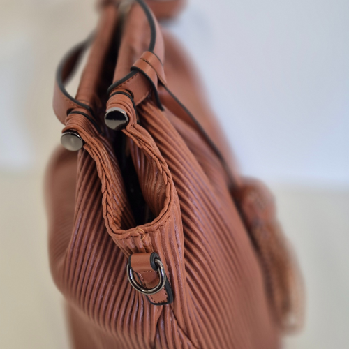 La borsa Arizona è un inno all’eleganza naturale e alla raffinatezza quotidiana. Realizzata in morbida ecopelle con un sofisticato motivo a costine, unisce stile e funzionalità in un design contemporaneo e armonioso. Il suo colore marrone caldo, ispirato ai toni della terra e del deserto, trasmette calore, equilibrio e carattere. La nappina decorativa aggiunge un tocco di movimento e personalità, rendendo Arizona un accessorio distintivo e versatile.